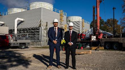 Figure 2 - NANO Nuclear Energy Founder and Chairman, Jay Yu along with Nuclear Physicist CEO James Walker on the University of Illinois site for the KRONOS MMR Event at the University of Illinois Urbana-Champaign to commemorate the start of real world site-characterization drilling for its KRONOS MMR Micro Modular Reactor Energy System prototype project in partnership with U of I.
