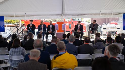 Figure 3 - Q&A Panel from left to right: NANO Nuclear Chief Technology Officer and Head of Reactor Development Dr. Florent Heidet, NANO Nuclear Founder, Chairman and President Jay Yu, Dr. Rashid Bashir, Dean of the U of I Grainger College of Engineering, NANO Nuclear Chief Executive Officer James Walker and Professor Caleb Brooks, Director of the Illinois Microreactor Demonstration Project. Credit to Heather Coit/Illinois Grainger Engineering.